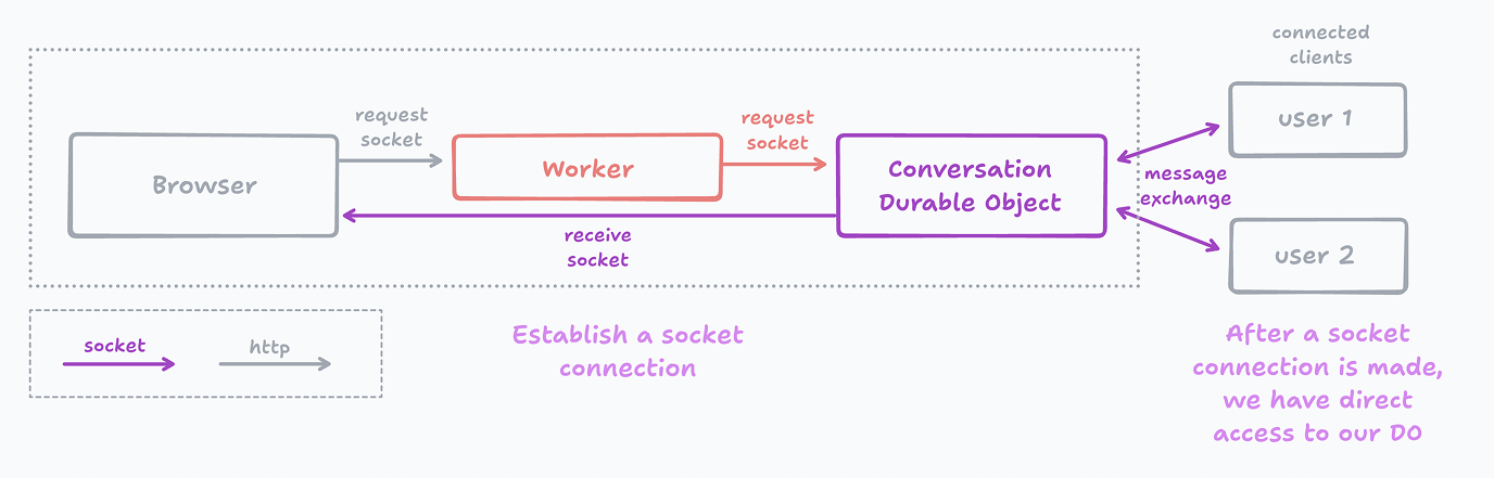 I built both of our services (user and conversation) as Durable Objects with the Cloudflare Actors library, a library I built that provides some helper functionality out of the box. One of those helpers we get for free is WebSocket connections and if you get interested enough in how it works and what functions are triggered when our Durable Object receives a /ws call you should check out: