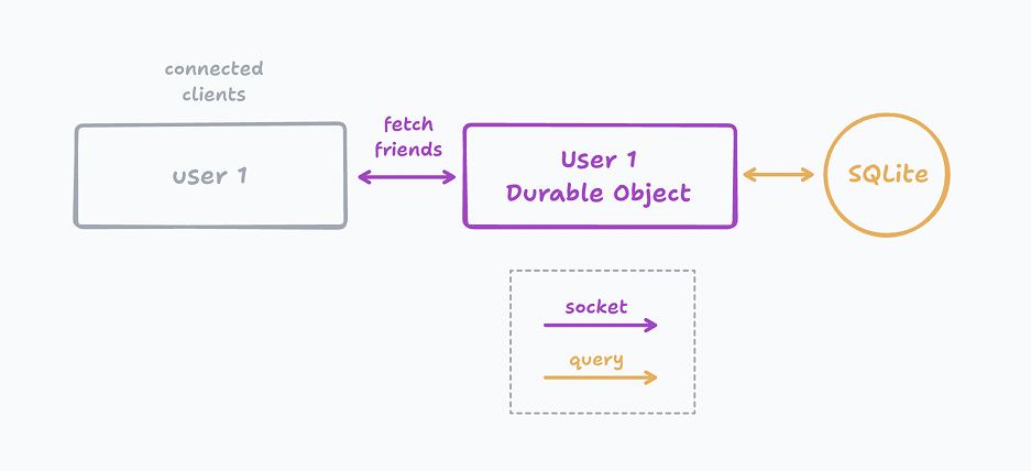 When we do a request to fetch our friend list all we do is hit our users DO and query the SQLite table for that information. Each user stores their own friends instead of that living in a singular central database. If you were to remove a friend or block a friend then an RPC function call would be made to that friends DO as well to remove you from their list.