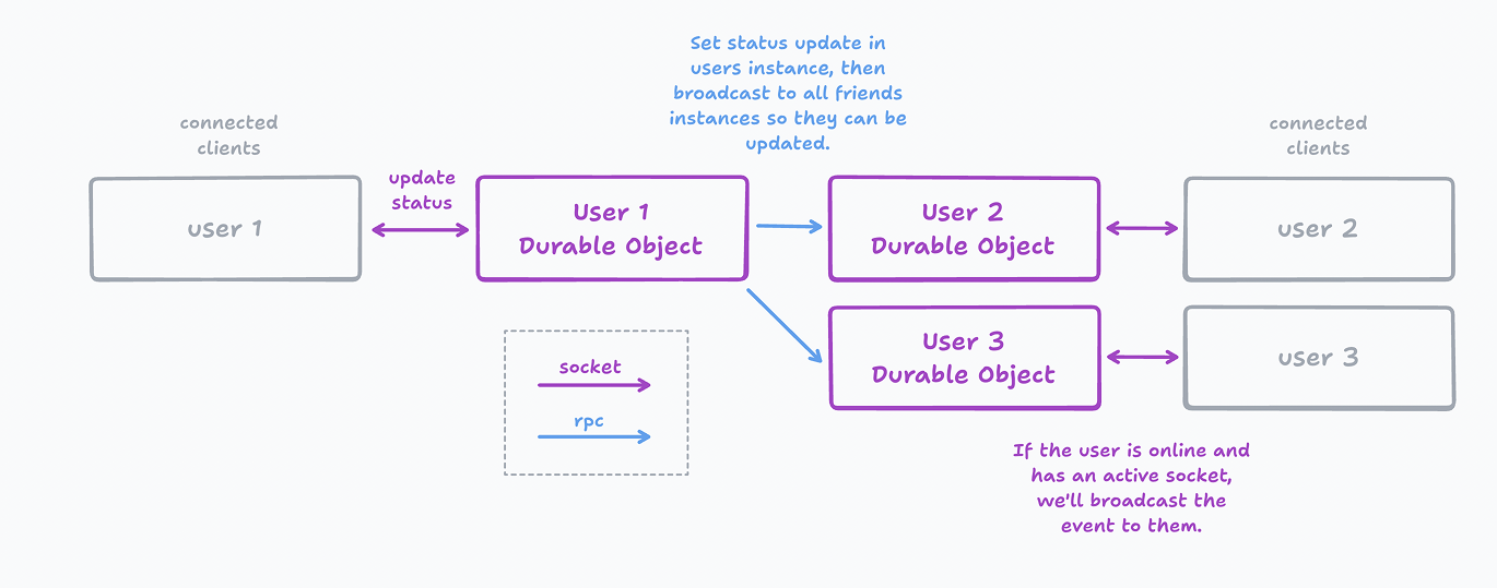 Each of the above handle message flow differently. For example, broadcasting a users status change will first hit the initiating users Durable Object, which in turn that DO will send an RPC message to each online friend so each individuals user DO can send a WebSocket message to their connected client(s).